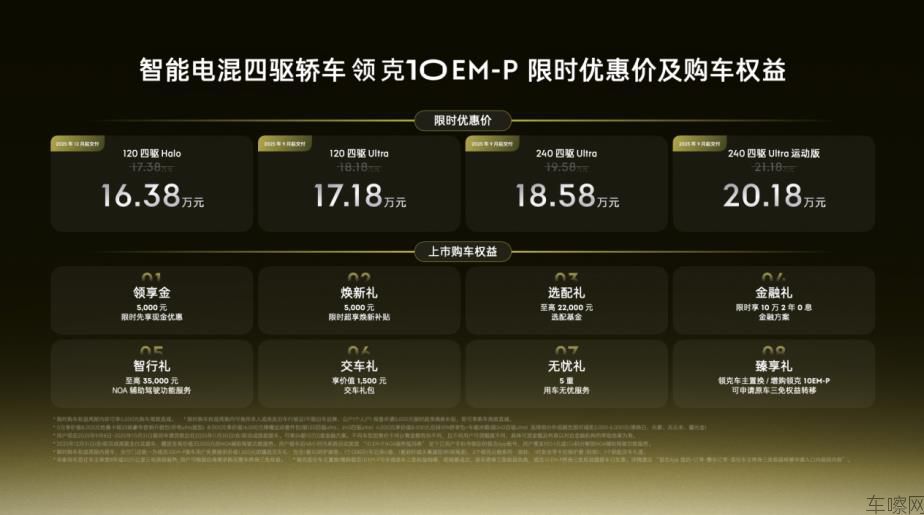【2025年9月8日,宁波】今日,“智能电混四驱轿车”领克10 EM-P正式上市,限时优惠价16.38万元起,共推出120四驱 Halo、120四驱 Ultra、240四驱 Ultra、240四驱 Ultra运动版四个版型,满足用户的多元需求。此外,领克10 EM-P还推出8重购车权益,用户在202...查看详情