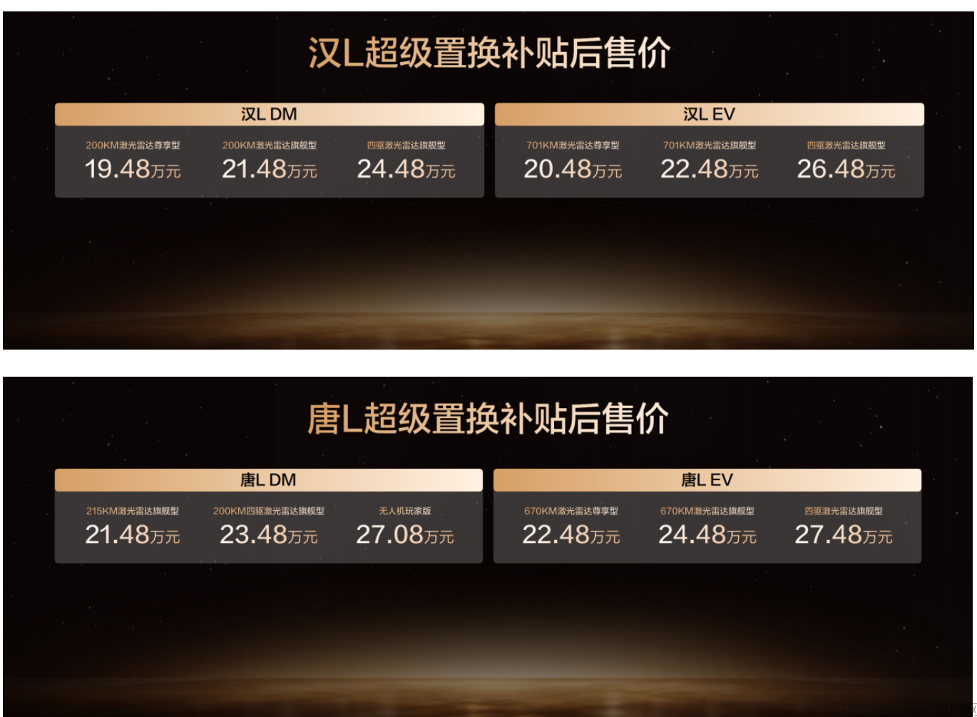 11月21日,比亚迪划时代旗舰车型汉L唐L携新车色及OTA正式发布。其中,汉L EV、唐L EV搭载超级e平台全域千伏架构,以“兆瓦闪充 油电同速”,彻底终结纯电补能焦虑;汉L DM、唐L DM标配第五代DM技术,兼顾超强性能与超级效能。此次,汉L唐L全新解锁“车位到车位”领航辅助功能,并带来全新车...查看详情
